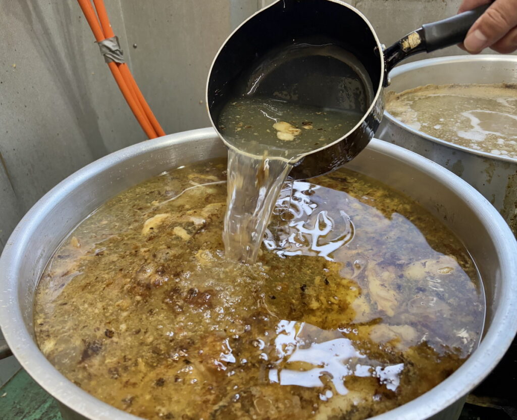 スープのおいしさの秘密は、牛の肋骨(ろっこつ)と大腿(だいたい)骨を20時間以上かけてじっくり煮込むこと。