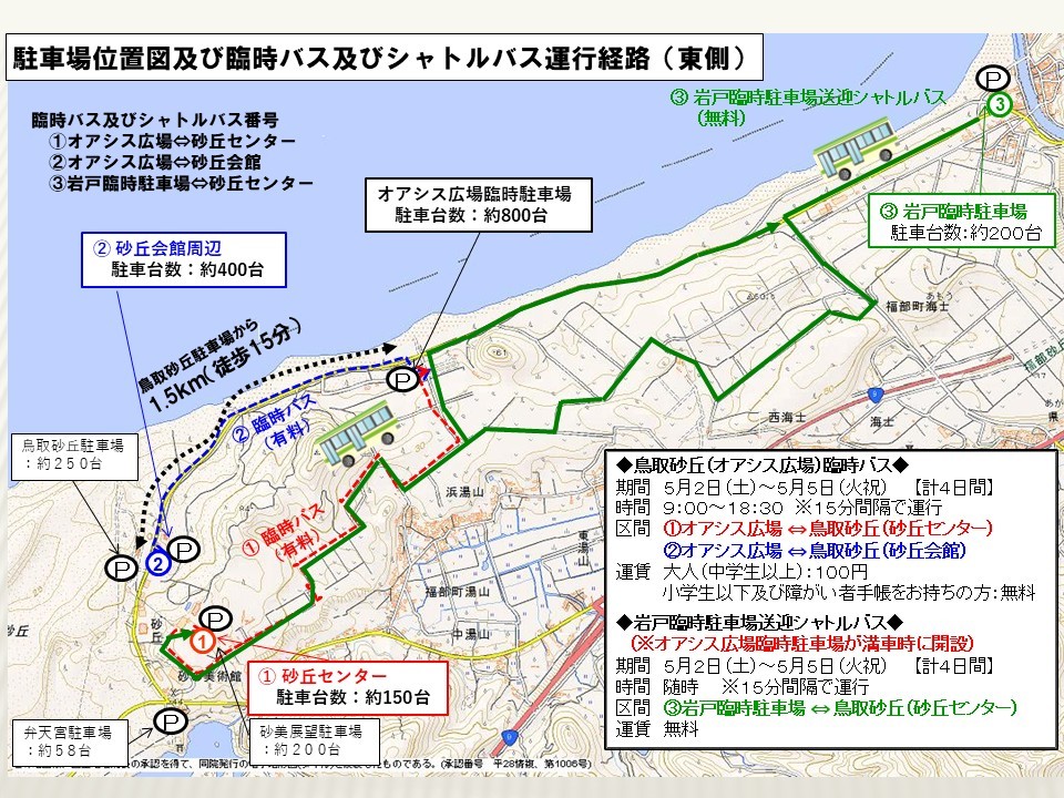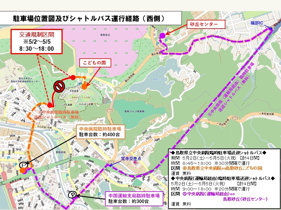 鳥取市丸山にある中国運輸支局にも臨時駐車場が設けられ、鳥取県立中央病院から中国運輸局鳥取運輸支局経由で砂丘センターまでのシャトルバスを20分毎に運行します。(場所:鳥取県鳥取市丸山町224)