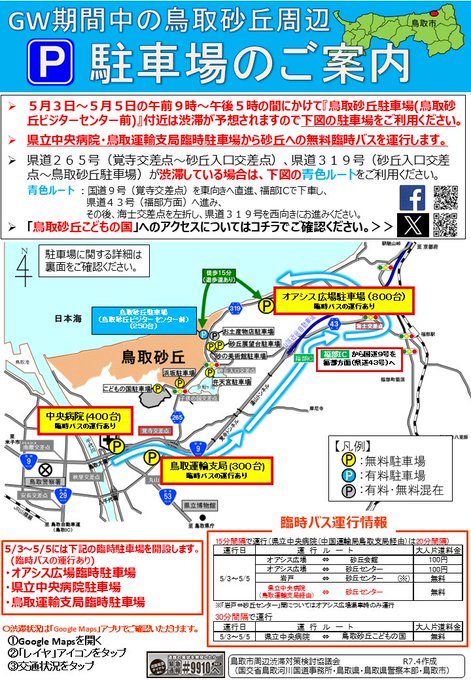 国道9号沿いにある県立中央病院駐車場を臨時駐車場として開放。鳥取砂丘こどもの国行きの送迎バスを発着しています。※鳥取砂丘には行かないので注意