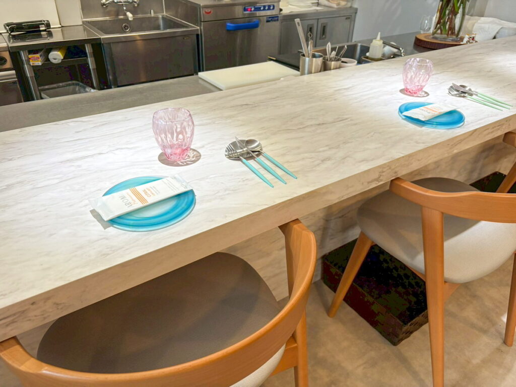 萩ガラスなどの素敵な器が並んだ、オープンカウンターの席へ案内していただきました。