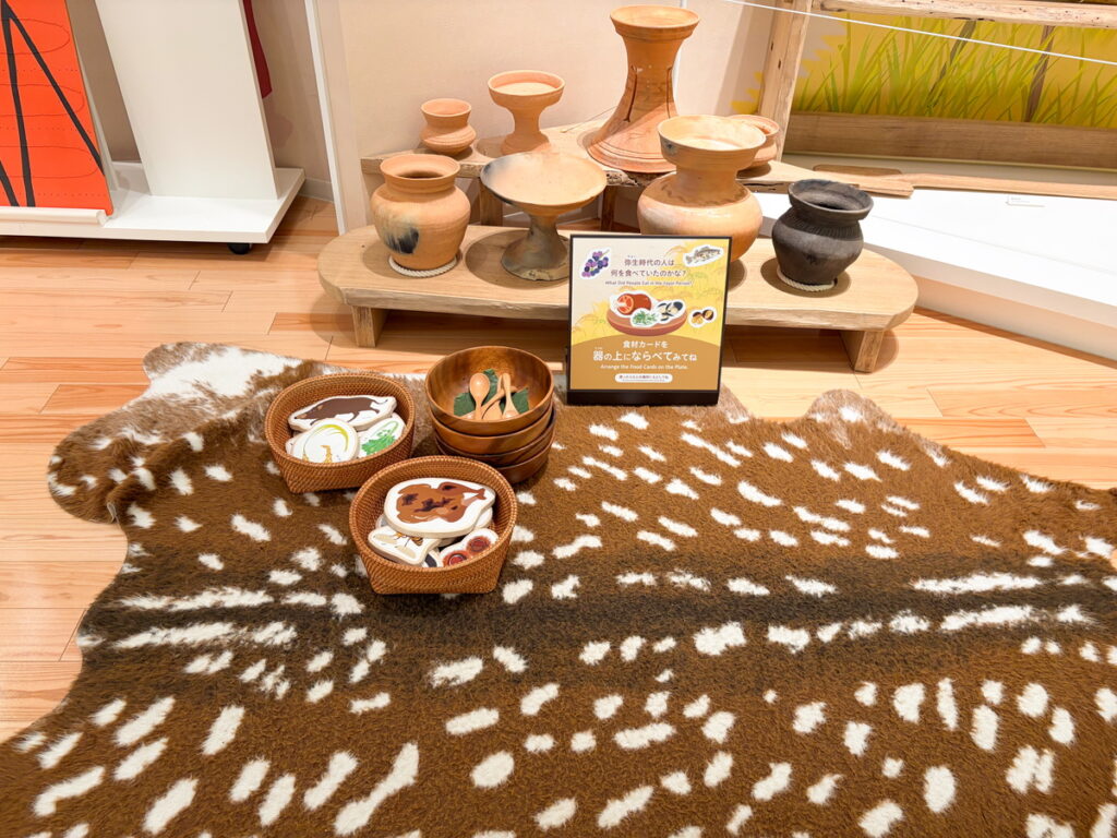 子どもに人気なのが、食材のカードと器を使って当時の食卓を再現するコーナー。