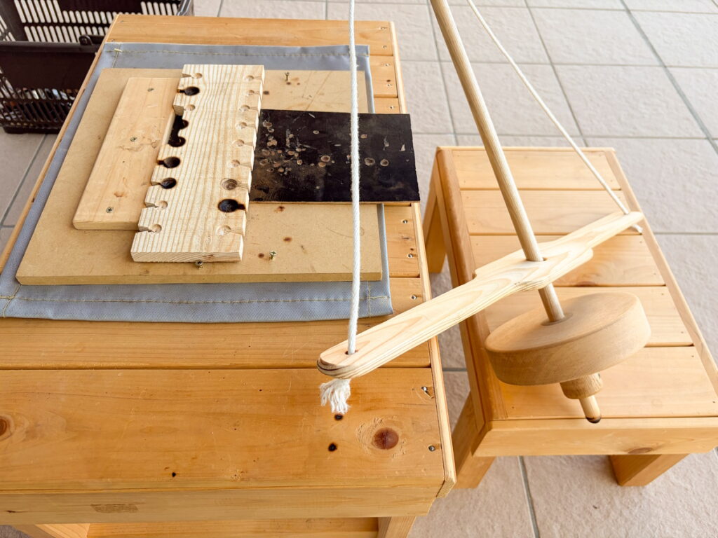 舞切り式という縄文時代から使われていた方法に挑戦しました。摩擦熱を利用して木くずから火種をつくります。