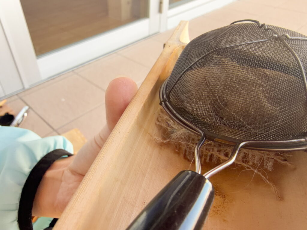 黒い粉に混ざって赤い火の玉”火種”が出てくるので麻わたに移します。火が作れそうで期待が高まります。