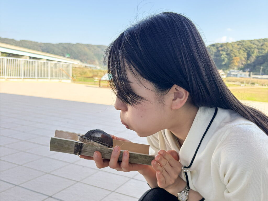 息を細く長く吹きかけて火をつくります。ここがとても難しいです。火種を作るために体力仕事をした後なので息が続きません。