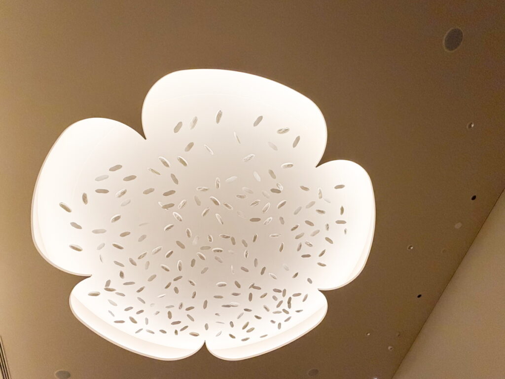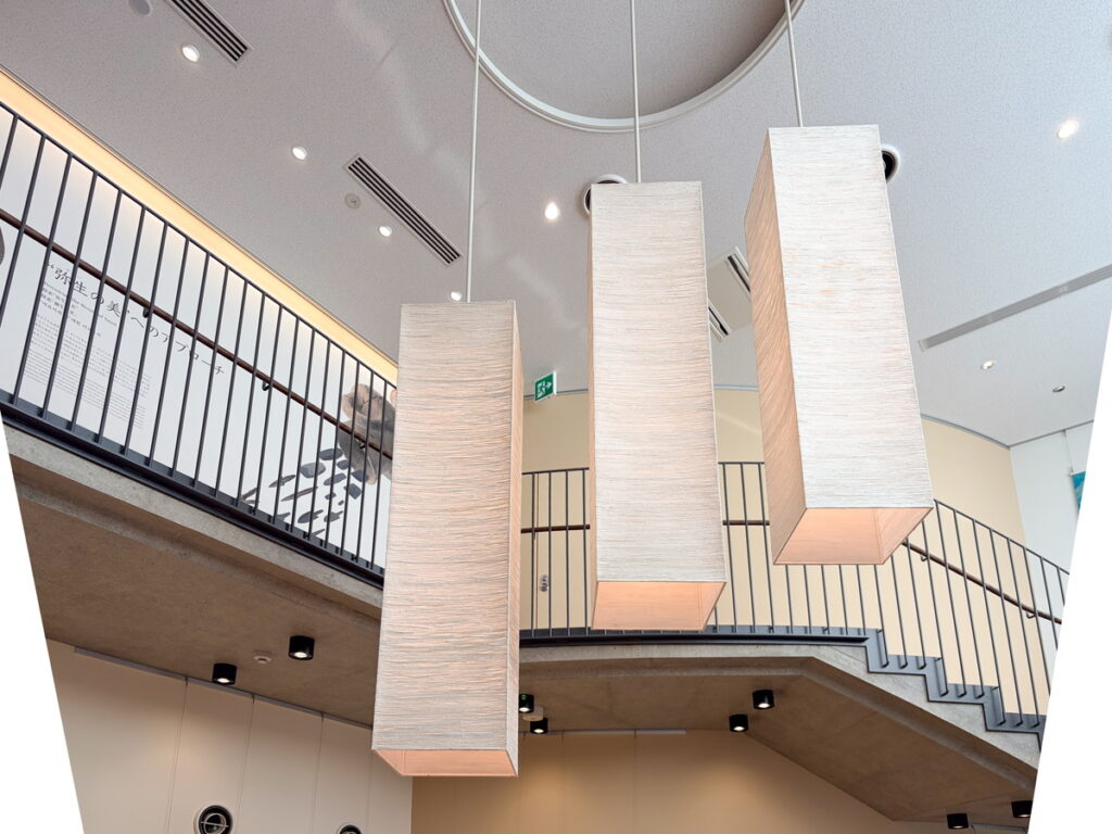 天井からイヤリングのようにぶらさがっているこのランプは青谷で作られている伝統的な因州和紙が用いられています。