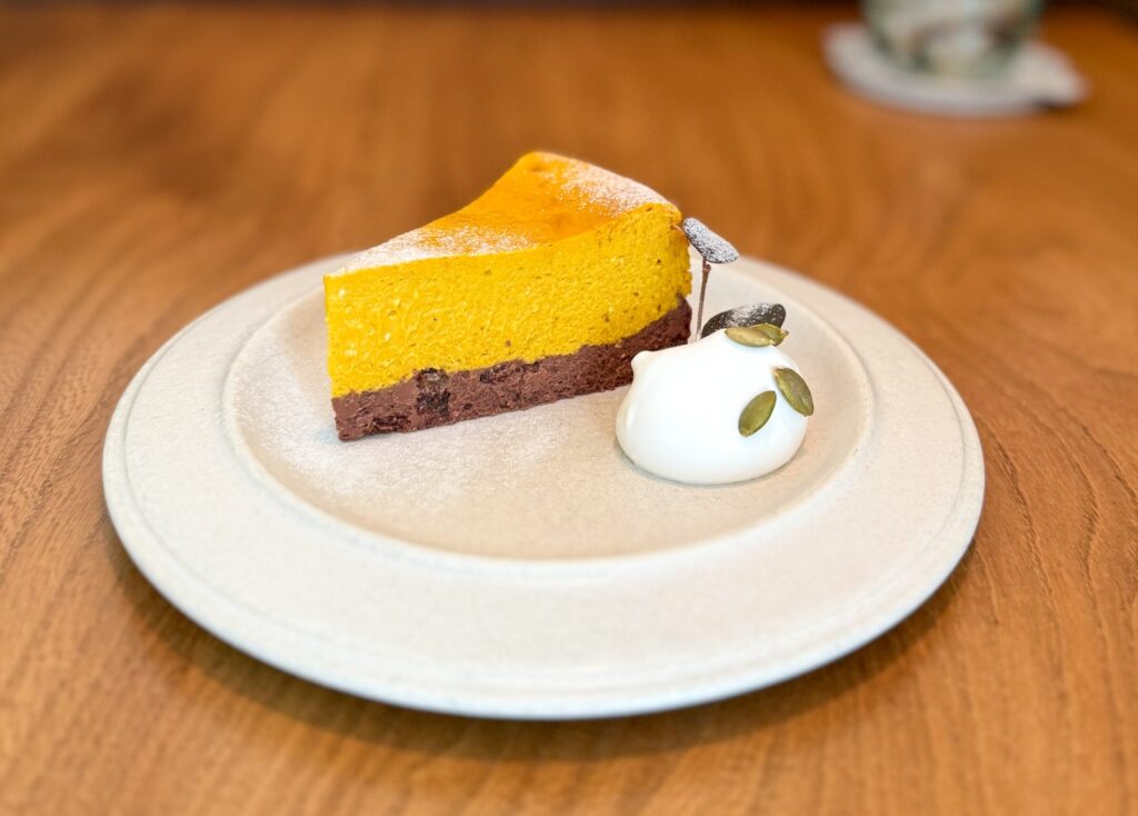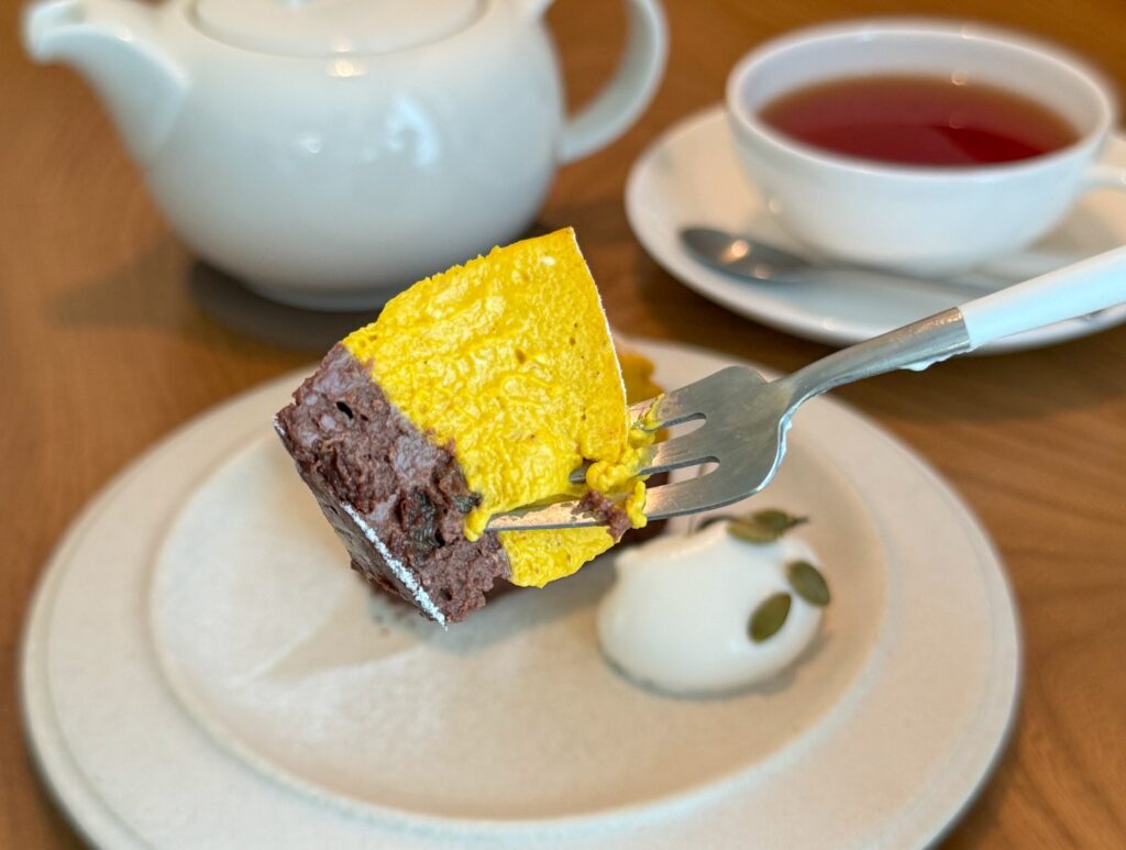 上がかぼちゃ、下がチョコ&ラムの2層仕立てになっていて、別々に食べても一緒に食べても、一口ごとに味わいが変わります。