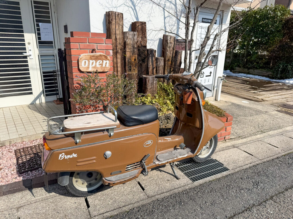 可愛い茶色のバイクが入り口の目印です。