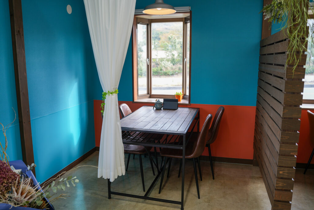 ブルーとオレンジのカラーが印象的で、まるで絵本の中に迷い込んだような世界観。