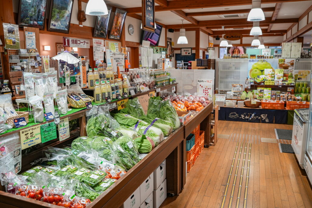 地元の新鮮野菜や果物、お土産品が並ぶ売店と、食事メニューも豊富なレストランが入っています。
