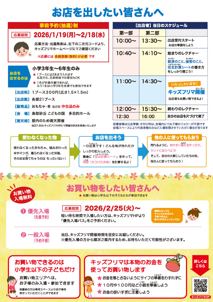 物の売り買いを通して、お金を稼ぐ「商売」の面白さや、物を大切にするリユースの意識を身につけることができますよ!お買い物ができるのは小学生以下のお子様だけです!保護者の方は専用スペースよりお子様を見守っていただくことができます!参加方法は優先入場と一般入場の二通り!詳しくはHPをご確認ください!