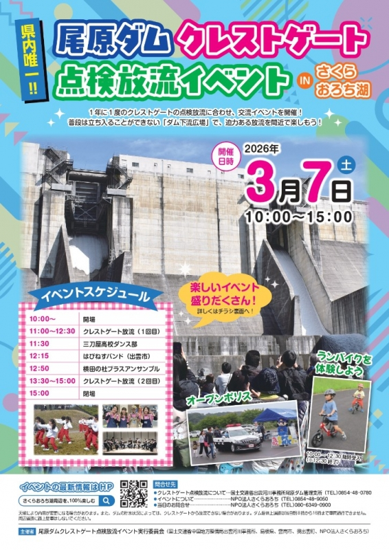尾原ダムのクレストゲートの点検放流に合わせ、「尾原ダム クレストゲート点検放流イベントINさくらおろち湖」を開催します。