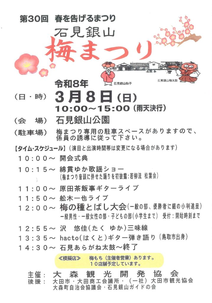 石見銀山に春の訪れを告げる「梅まつり」が、今年も賑やかに開催されます!