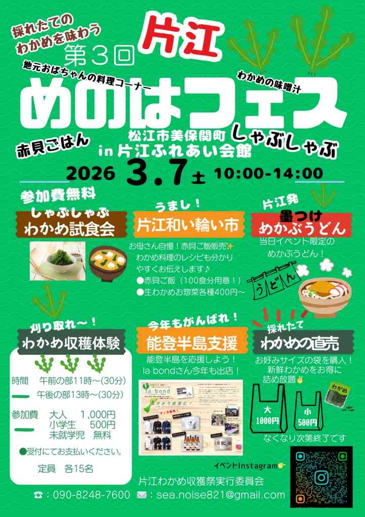 人口減少に悩む島根県松江市美保関町片江地区を昔から盛んに行われてきたわかめ養殖を軸に地元有志で盛り上げています!この土地の魅力を後世に伝えていきたいそんな想いが詰まった【めのはフェス】