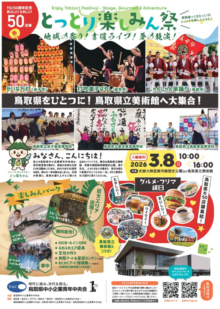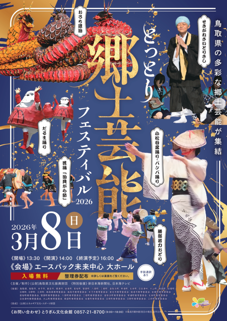 鳥取県の伝統が一堂に集う「とっとり郷土芸能フェスティバル2026」。県内各地の保存会や若者たちが、だるま踊りや盆踊り、神楽など多彩な郷土芸能を披露します。地域の誇りと文化を感じられる舞台で、世代を超えて楽しめる内容です!