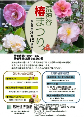 荒神谷史跡公園にようこそ!荒神谷では12月ごろから椿が咲き始め3月にはさまざまな種類の椿が開花します。