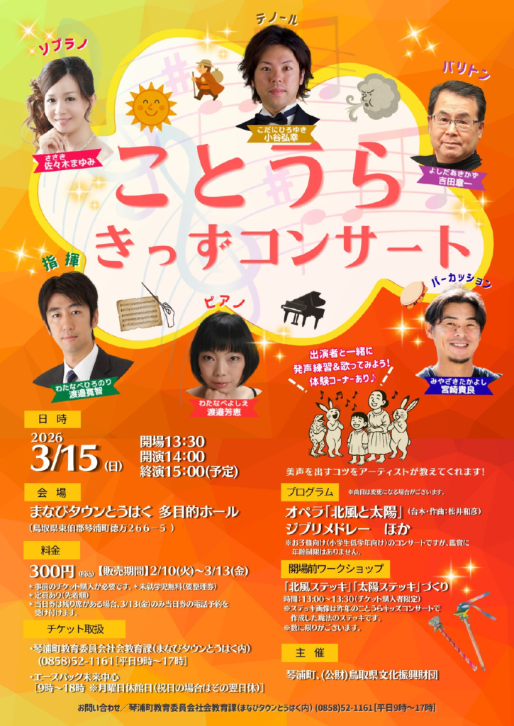 鳥取県にゆかりのある音楽家による親子で楽しめるコンサートを今年も開催します。