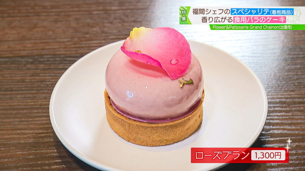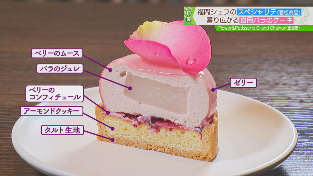 福間シェフの親戚にあたる奥出雲薔薇園(大田市)の「さ姫」と「アップルロゼ」という食用のバラを使用したケーキです。