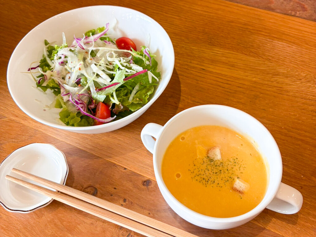 サラダ、スープ、ライスorフォカッチャ、ドリンクがセットです。