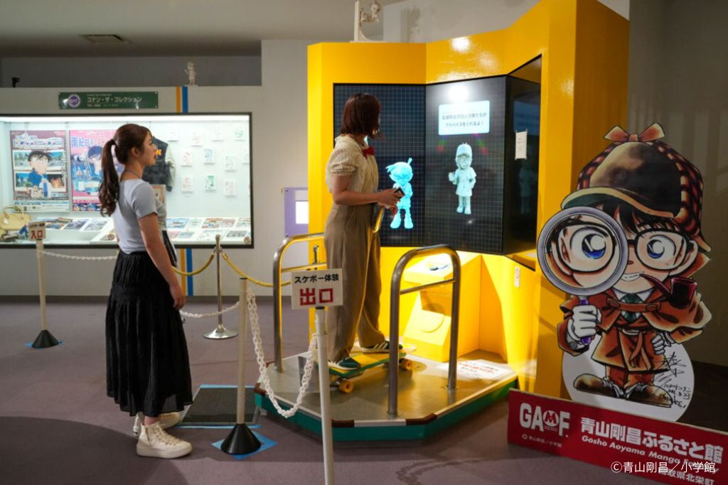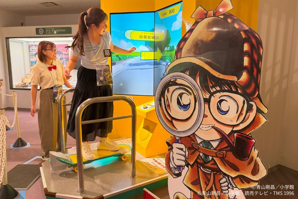 展示を見るだけではなく、実際に体験できるのも青山剛昌ふるさと館の魅力。特に人気なのが阿笠博士の発明品 「ターボエンジン付スケートボード」 の体験コーナー!コナン君が犯人を追いかけるときに乗っているあのスケボーを、ゲーム感覚で体験できるんです。