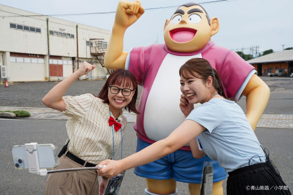 米花商店街からJR由良駅方面に向かって歩くと、道沿いにはキャラクターのブロンズ像が点在。