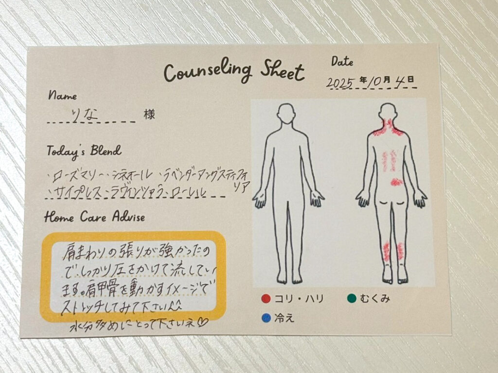 施術後には身体の状態を丁寧にフィードバックしてもらえて、あまり体と向き合う事がないので、これもとても嬉しかったです!