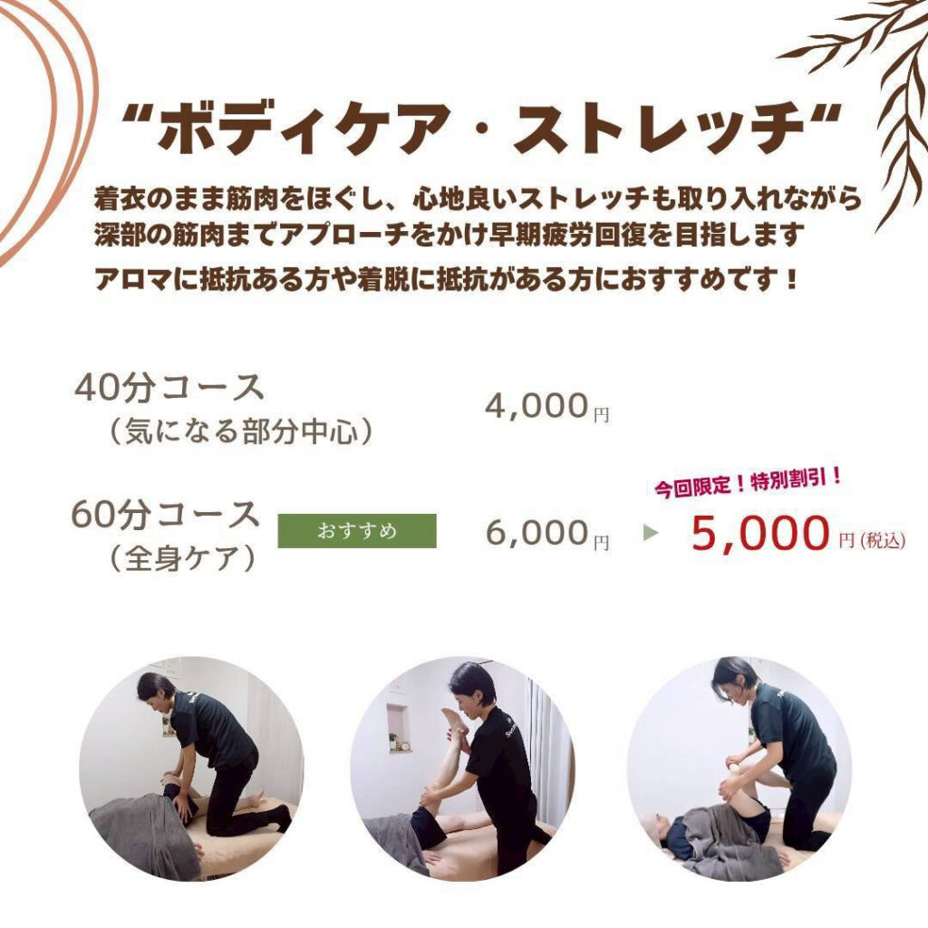 洋服の着脱やアロマに少し抵抗がある方は、着衣のまま筋肉をほぐし、心地良いストレッチも取り入れながら身体のコンディションを整えることができる「ボディケア・ストレッチ」も可能。