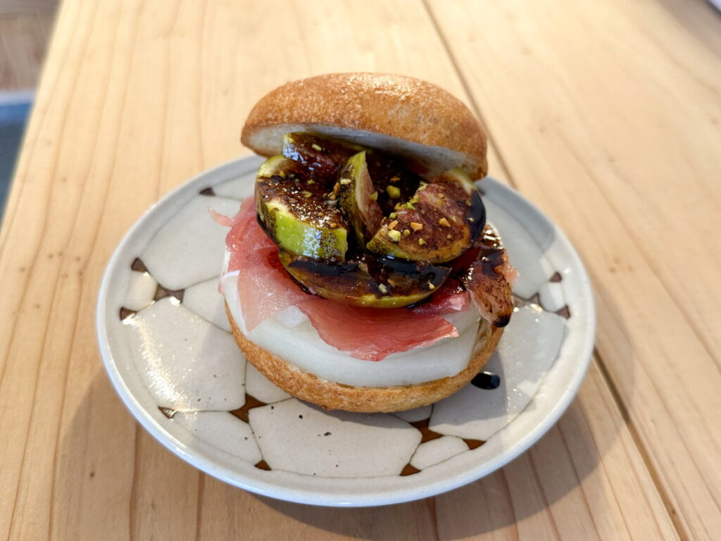 歯切れは良いですがモチっとしたベーグルに梨のシャキシャキ感とイチジクのツブツブ感が合わさって、食感の豊かさを楽しめます。