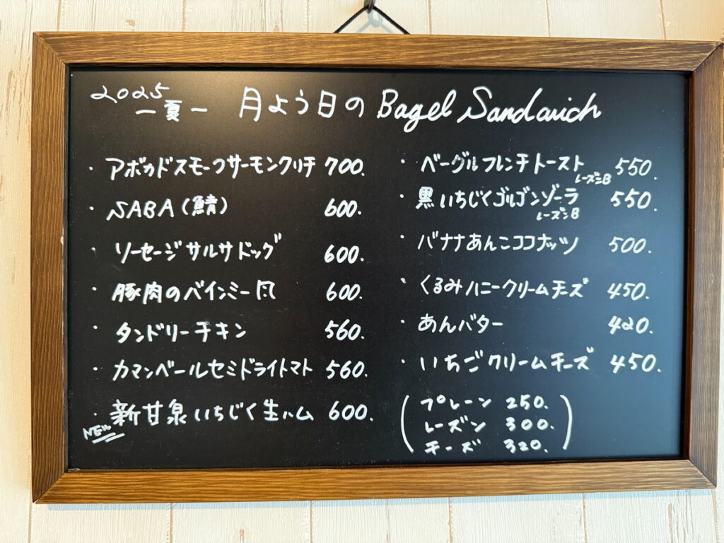 季節ごとにメニューは変わり、ご飯系からスイーツ系まで、様々なベーグルサンドが並んでいます。