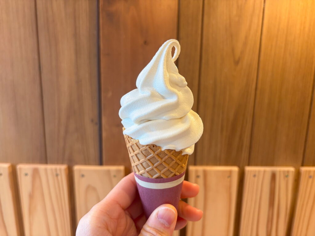 冬でも食べたくなる優しい味わいの豆乳ソフトクリーム(330円)。大豆由来の甘みがありつつさっぱりしています。