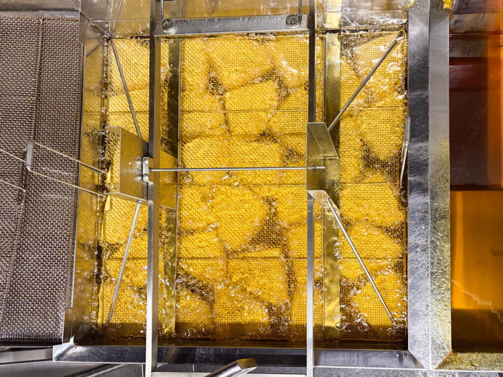 低温の油(左)と高温の油(右)で二度揚げすることで食べ応えのある食感に仕上げます。