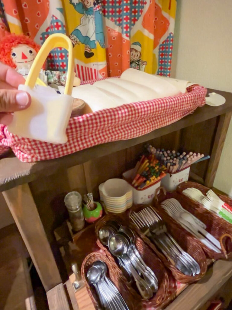 ・夕食会場には、ハイチェア、麺カッター、子供カトラリー、エプロン