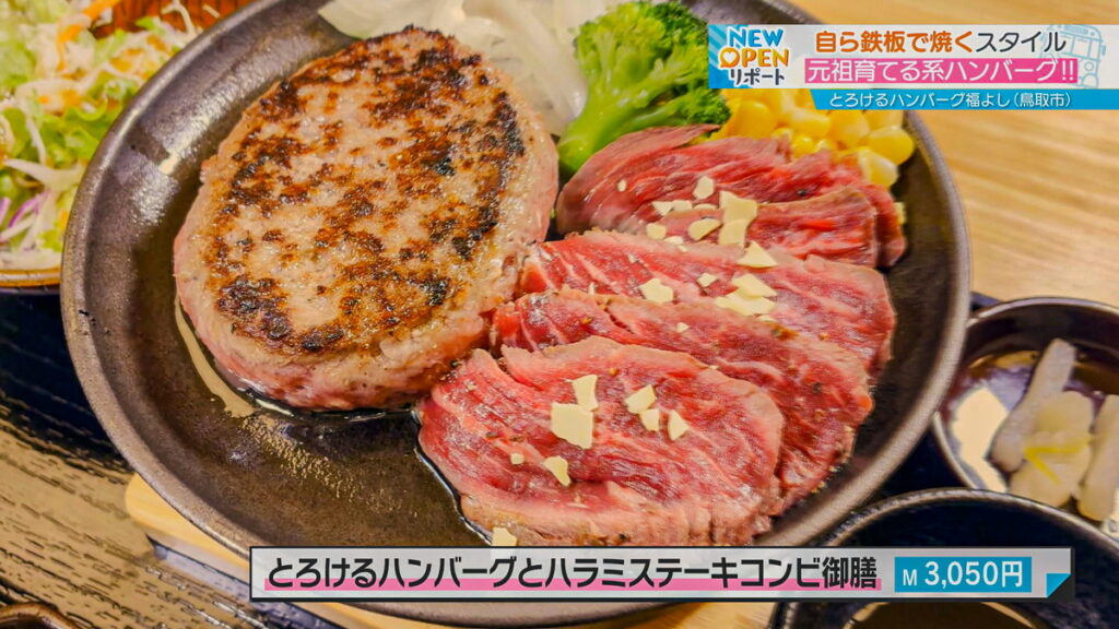 人気メニュー「とろけるハンバーグ御膳とハラミステーキコンビ御膳M(3,050円)」