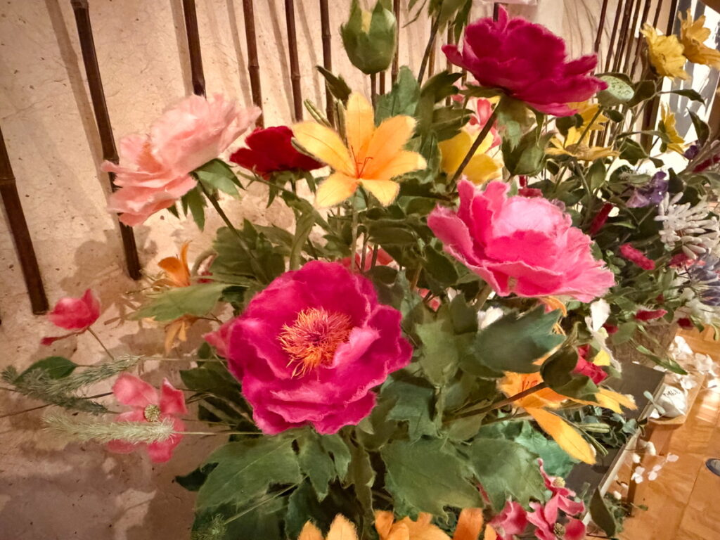 こちらも和紙で作られた作品です。近づいてよく見ると和紙の花びらがふわふわしています。優しいタッチの絵画に登場するお花に雰囲気が似ています。生花にも造花にもない和紙独自の表現力です。