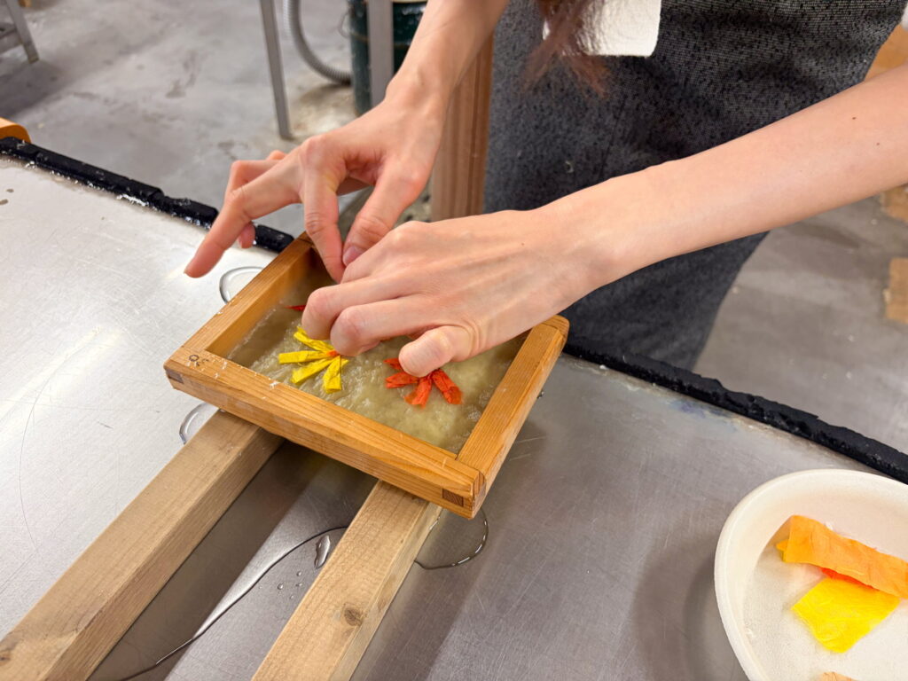 水で濡らした型で原液を1回すくいます。ぬるっとした重たさは原料づくりに奮闘された方の手間に気づかせてくれます。