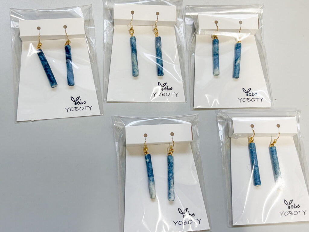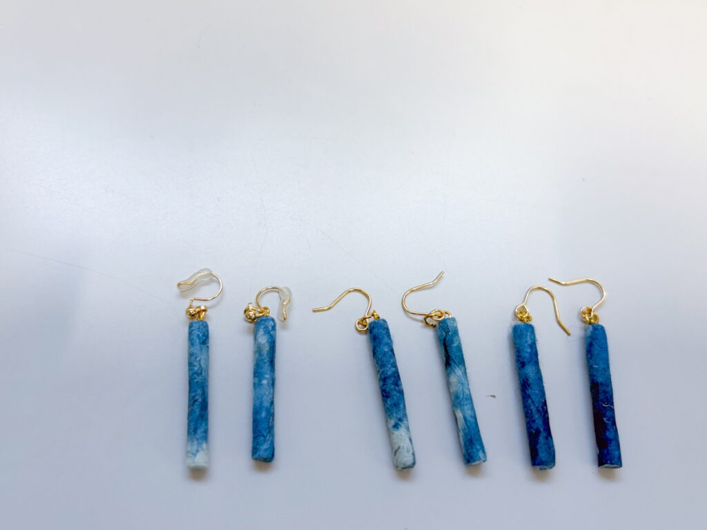 因州和紙の魅力を新しい形で伝えたい、と立ち上げられたブランドで、写真の形のイヤリングは、一枚の藍染めした和紙からグラデーションが綺麗に表れるように切り取って作っているそうです。