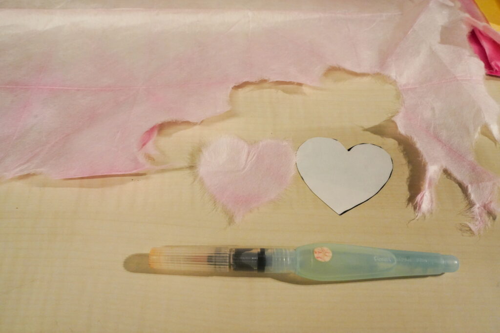 私も花びらづくりを体験しました。水筆で型を縁取って和紙を柔らかくし、手でちぎります。均一の太さで書かないとちぎったときに違う形ができてしまいます。