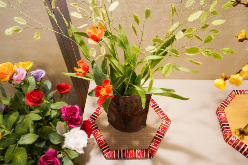 展示の仕方を含めて一つの作品になっているようです。ぜひ花瓶の色や形、花瓶が置かれている台などにも注目して楽しんでみてください。