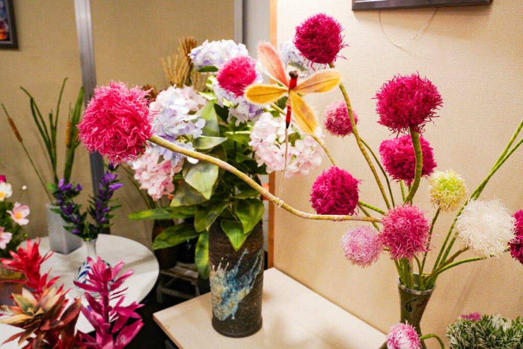 一歩足を踏み入れるとお花の世界が一面に広がっています。123点の作品が”咲いて”います。先生の前田さんをはじめ、3名で作り上げたそうです。
