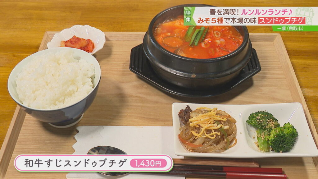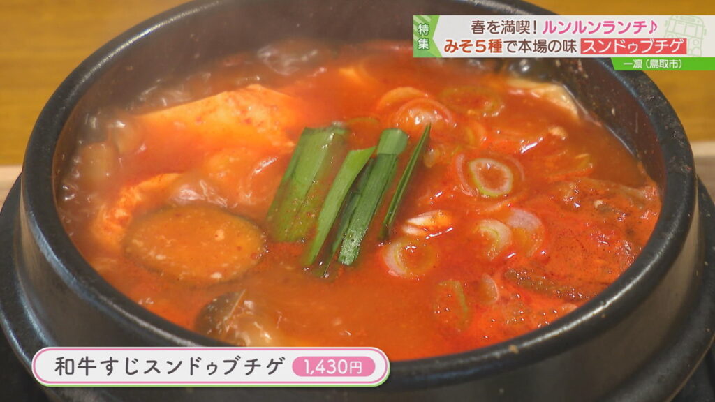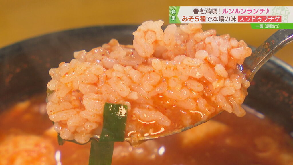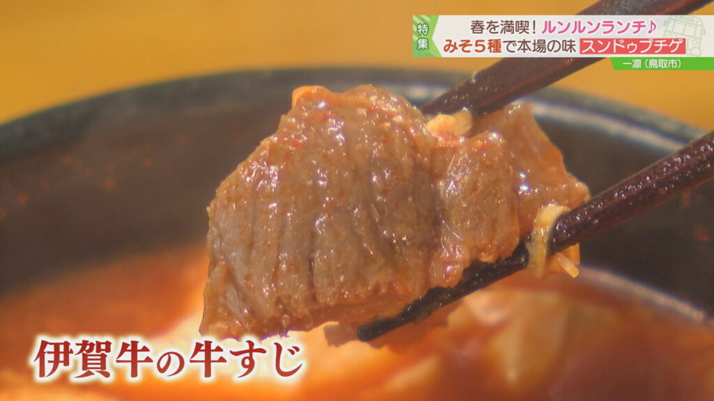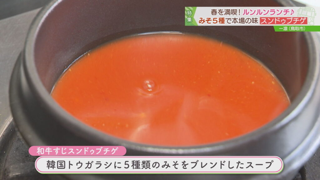 韓国の唐辛子を使い、5種類のみそをブレンドしたスープにタマネギやズッキーニ、ナスなど野菜を入れて、牛すじを加え、しっかりと煮て食材の旨みを出します。