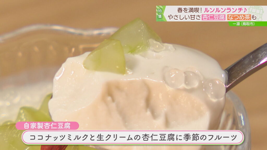 自家製の杏仁豆腐はココナッツミルクと生クリームの杏仁豆腐に季節のフルーツがのっています。