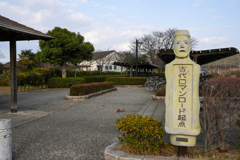 神社の最寄り駅、淀江駅から展示館へ向かう道「古代ロマンロード」には、石馬モチーフのベンチや看板が点在しています!