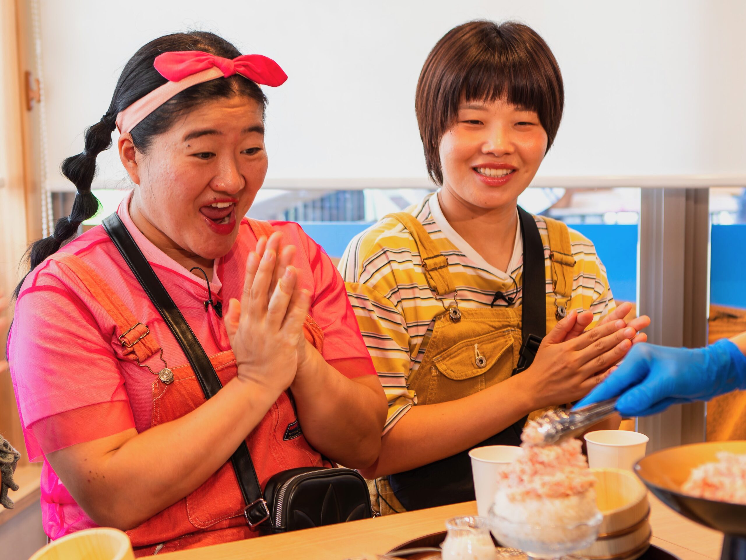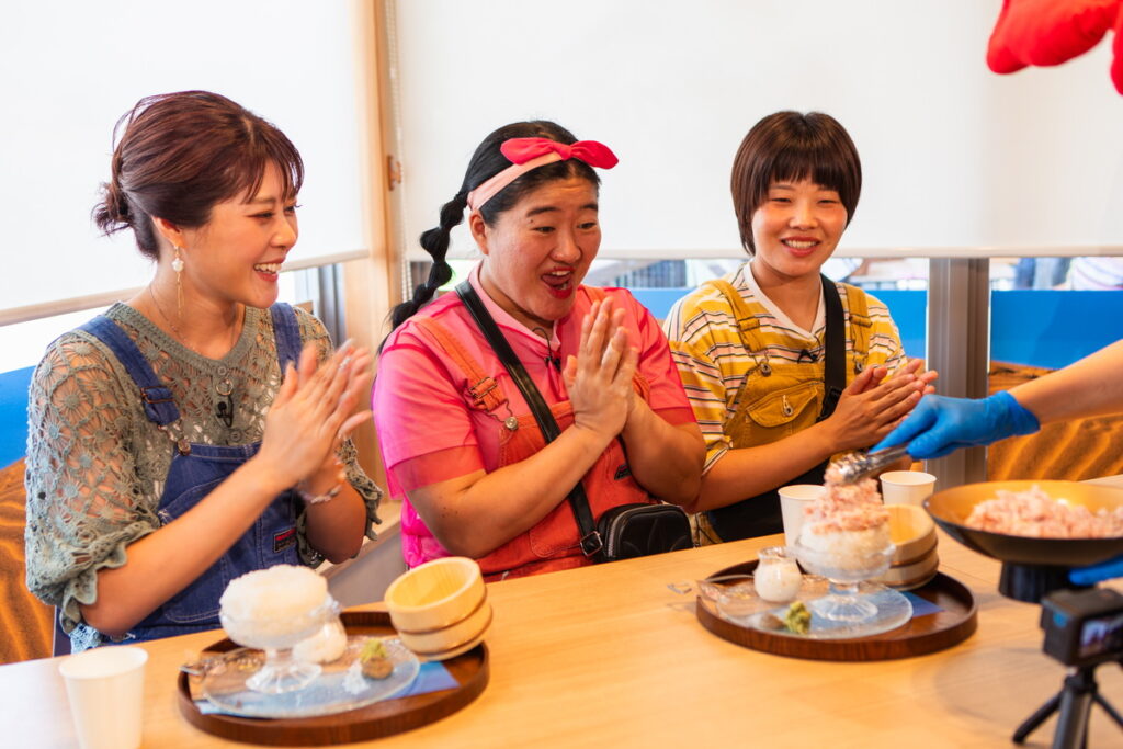 溢れ落ちるほど盛られた衝撃のカニ丼と、店員さんたちの盛り上がりをお楽しみに。