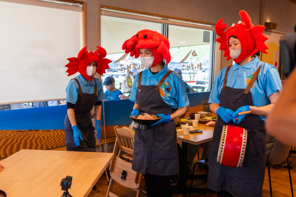 するとお店の奥から出てきたのは、カニをかぶった店員さんたち…。