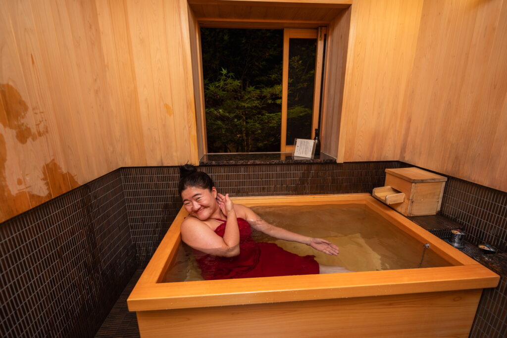 日本酒の香りとヒノキの香りが混ざり、贅沢なお風呂タイムを楽しんでいると…なんだか、ほろよい気分に?