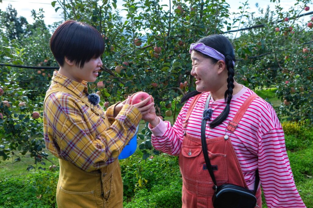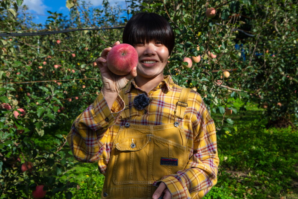 たくさん実ったリンゴの中から美味しいリンゴの見分け方をお聞きすると、リンゴの表面に見える縦シマがよく見えるものがいいと言われているんだそう!