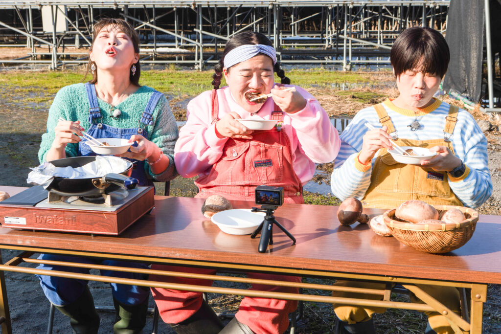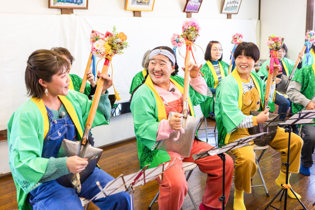 今回はとある珍しい楽器の演奏体験に向かった三人。軽快な音がする先に向かうと、スコップ三味線を奏でる『スコシャン』の皆さんが!