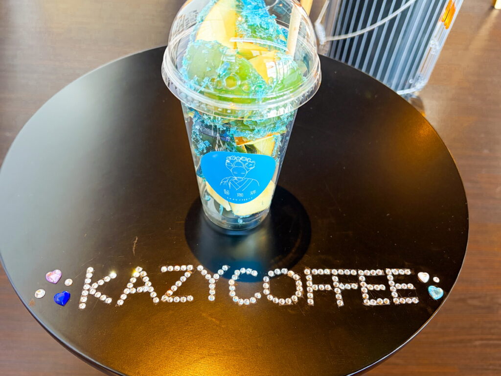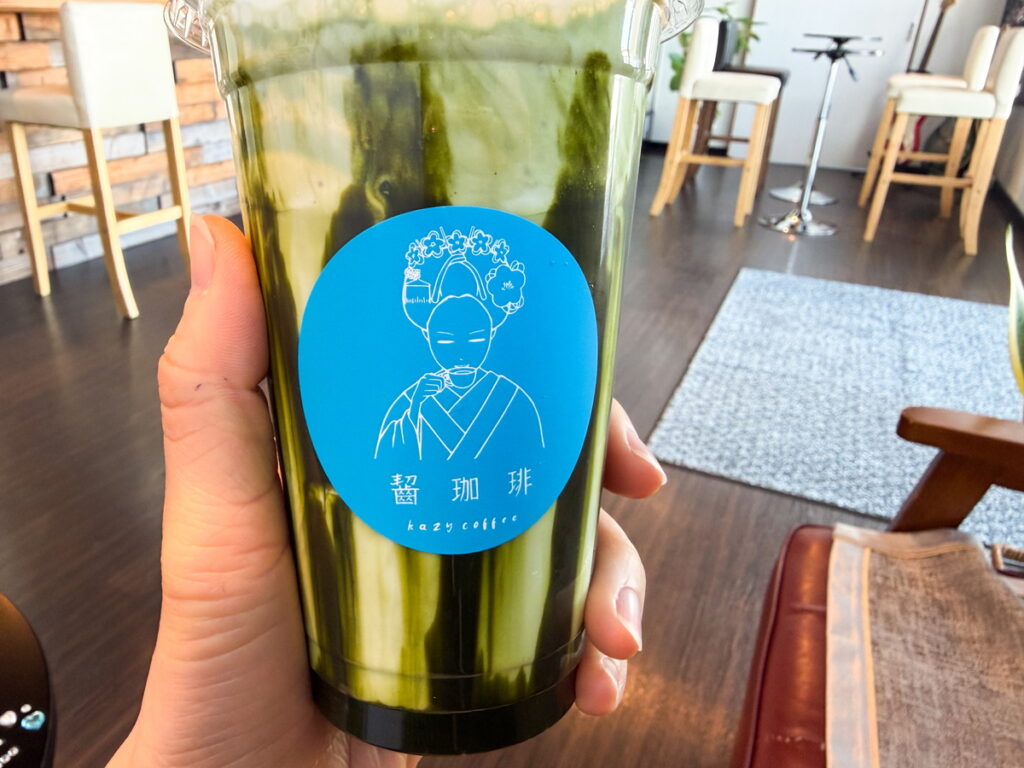 目を引く鮮やかな青色のロゴのカフェ。実はこのロゴをよく見ると京都の舞子さんがコップをかじっているんです。店名の「kazy(かじー)coffee」につながっています。ユーモアのある店名ですね!