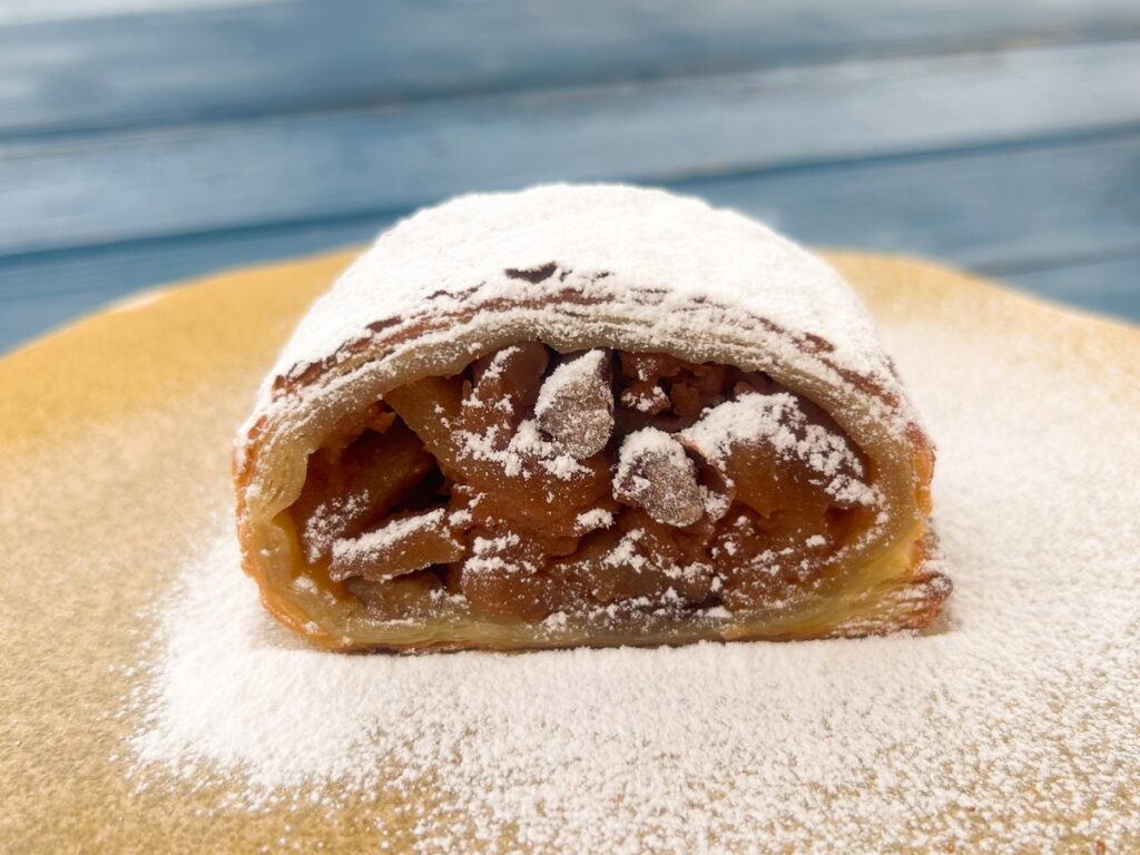 このパイの外側はパリパリで内側はふわふわ、中身はしっとりしていて色々な食感が口の中に押し寄せてきます。食べているうちにフルーツにしみ込んだ味わいが出現します。