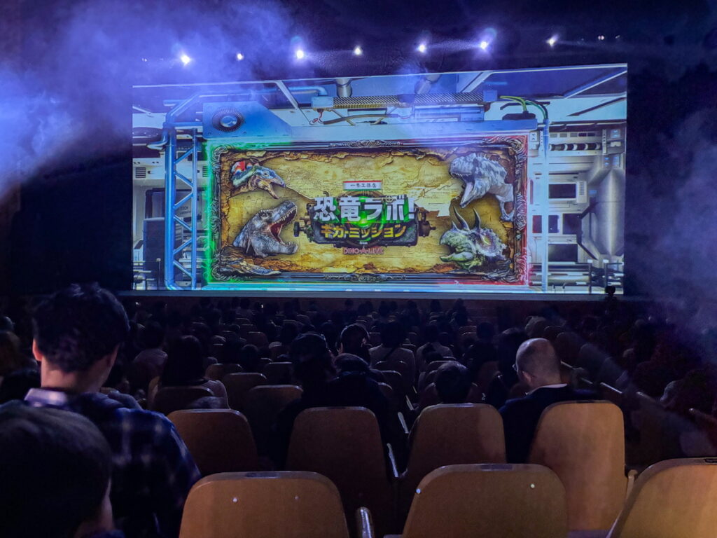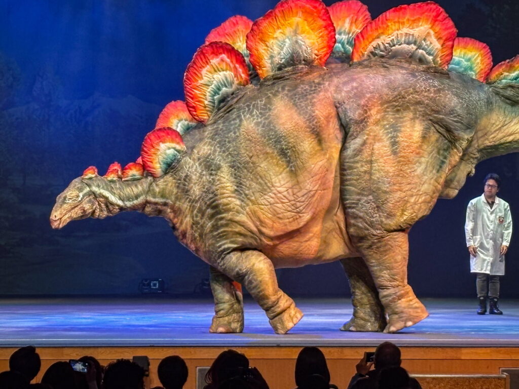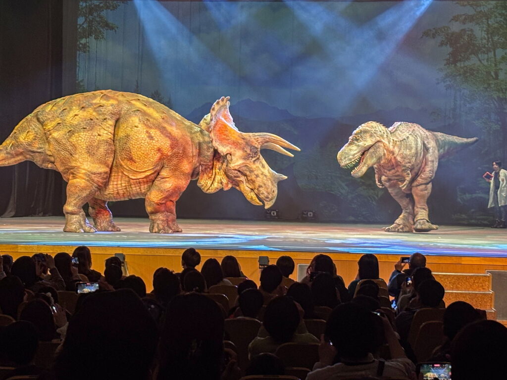 映像ではなく、リアルな恐竜がステージの上を駆け回るという、迫力たっぷりのステージショー。