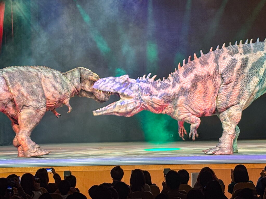 特に圧巻だったのが、恐竜同士の大迫力バトルシーン!強大な恐竜同士が激しく戦い、会場中が息をのむ瞬間は必見です。